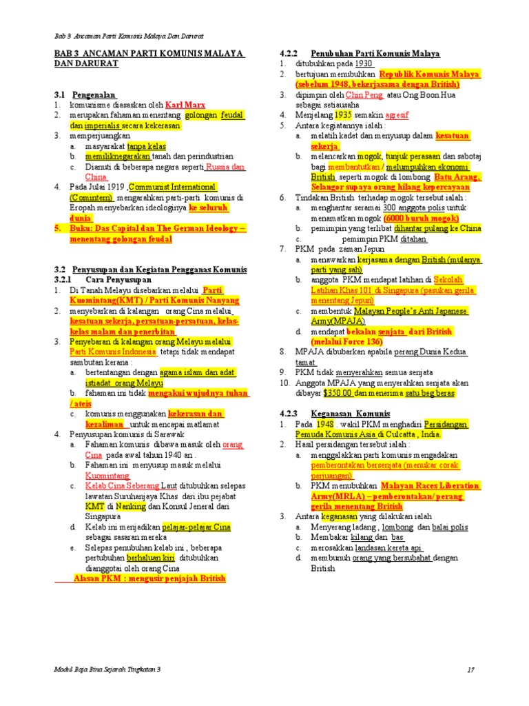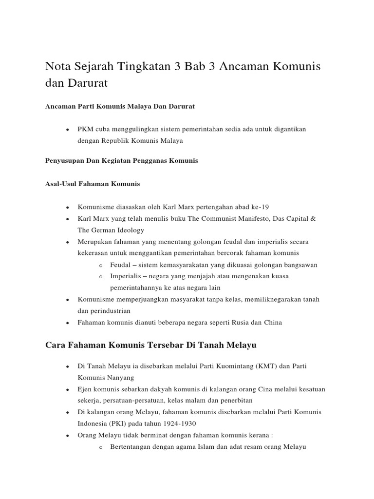 Ancaman parti komunis malaya dan darurat. Bab 3 ancaman parti komunis malaya dan darurat. Ancaman komunis yang telah menggugat keselamatan awam di tanah melayu. Darurat ini diikuti dengan penarikan hak hak sivil bukan semua hak hak sivil pemberian kuasa istimewa kepada pihak polis dan langkah langkah lain yang bertujuan untuk mengongkong kegiatan politik berhaluan kiri terutamanya yang membabitkan parti komunis malaya pkm. Nota bestari ting 3 bab3.