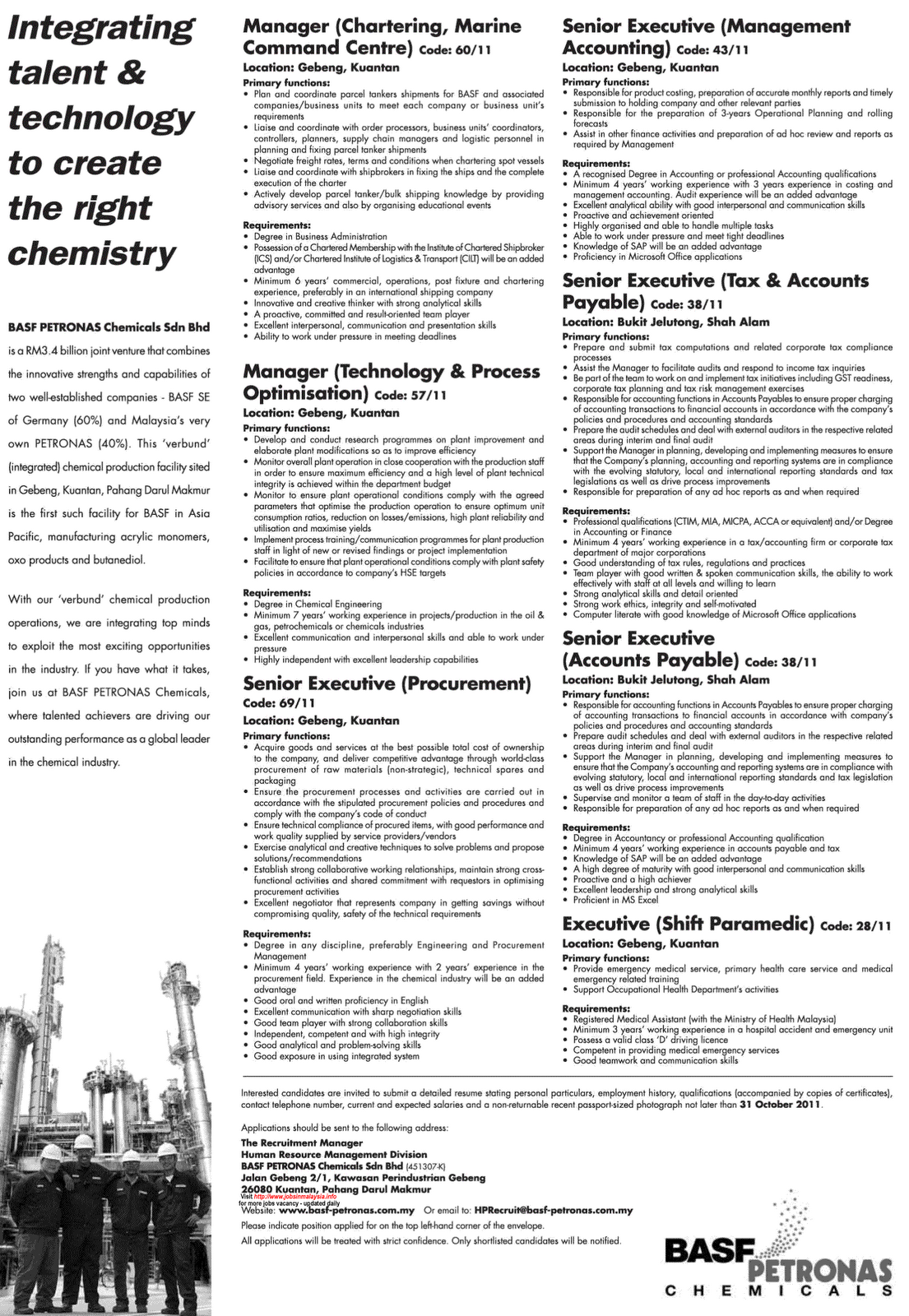 Latest Jobs Vacancies In Malaysia 2011 2012 Jobs Vacancies At Basf Petronas Chemicals Sdn Bhd October 2011