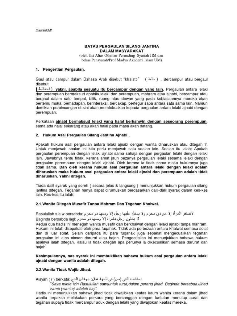 Batas pergaulan antara lelaki dan perempuan. Tidak berkembanglah sesuatu umat jika lelaki hanya berinteraksi dengan kaum lelakinya sahaja dan wanita berinteraksi dengan kaum wanitanya sahaja. Mereka mahukan lelaki yang tahu menjaga rukun islam menunaikan solat lima waktu sehari semalam berpuasa di bulan ramadhan menunaikan zakat dan sentiasa menjaga batas batas pergaulan di antara lelaki dan perempuan. Pergaulan ini dibolehkan dengan syarat syarat kedua dua pihak menjaga batas batas syarak seperti berpakaian menutup aurat menundukkan pandangan percakapan biasa yang tidak mengandungi unsur unsur fitnah dan tidak berkhalwat. Seorang perempuan bersendirian dalam perjalanan yang mungkin mendedahkannya kepada bahaya.