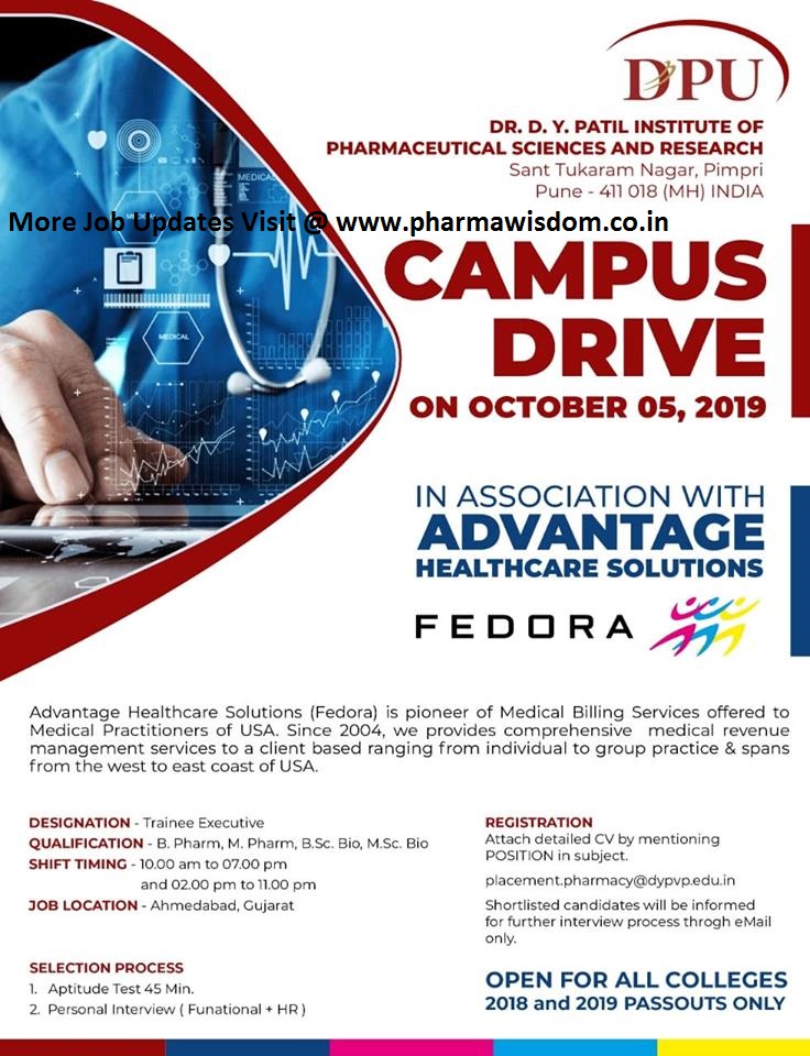 Advantage Healthcare Solutions Fedora Campus Drive For B Pharm M Pharm B Sc M Sc Freshers On 5th Oct 2019 Dpu Pune Pharma Wisdom