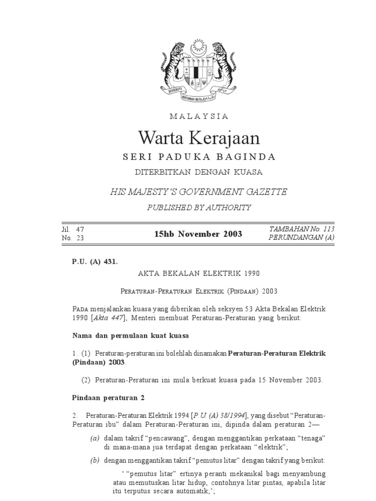 Akta Bekalan Elektrik Pindaan P U A 431 2003 Bm Bi 0