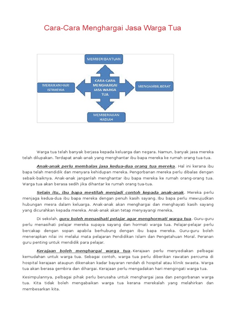 Cara cara menghargai jasa warga tua karangan galus warga tua telah banyak berjasa kepada keluarga dan negara. Cara cara menghargai warga tua warga tua merujuk kepada mereka yang berusia lebih daripada 60 tahun. Namun banyak jasa mereka telah dilupakan. Warga tua boleh dikategorikan sebagai golongan manusia yang berumur 50 tahun dan ke atas.