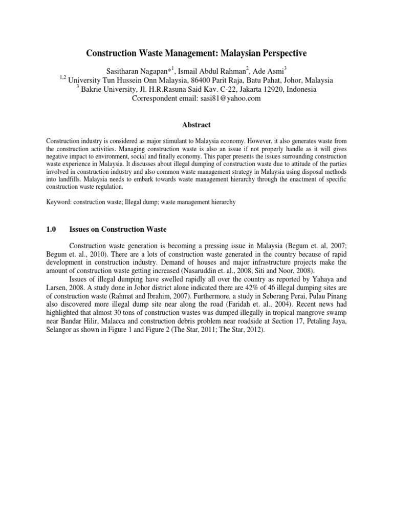 Pdf Construction Waste Management In Malaysia A Contractor S Perspective Rory Padfield Dr Effie Papargyropoulou And Anis Adila Abdullah Academia Edu