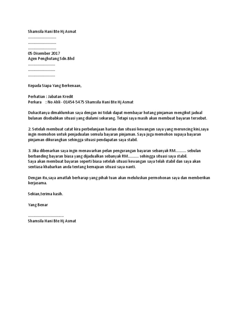 Contoh Surat Rayuan Pengurangan Bayaran Hutang Bulanan Ansuran Dan Lain Lain