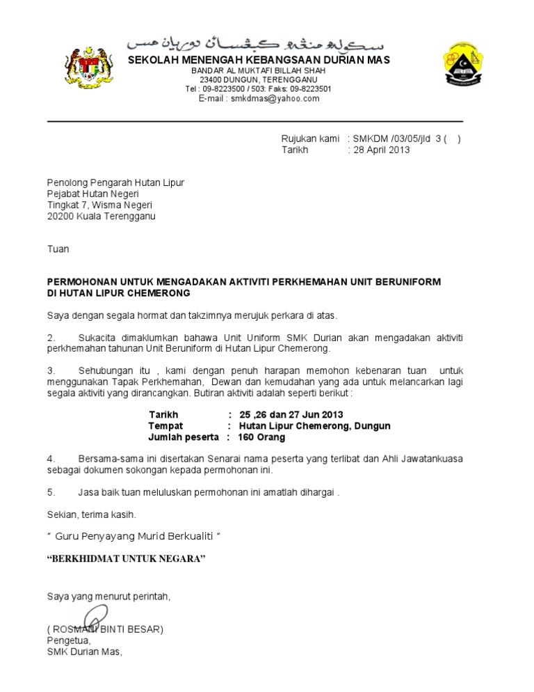 Surat Permohonan Mengadakan Perkhemahan Hutan Lipur Cemerong