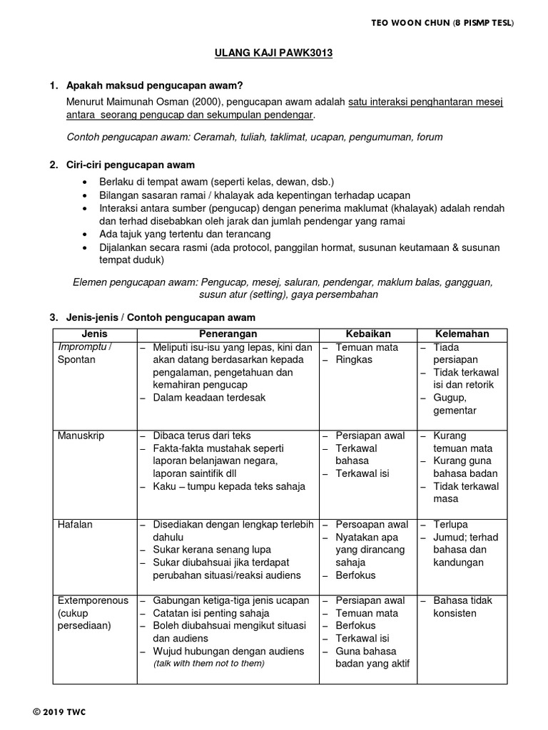 Nota Ulang Kaji Untuk Kuiz Kursus Pengucapan Awam Pawk3013 Tahun 2019