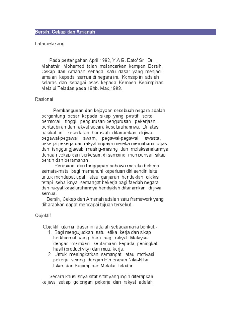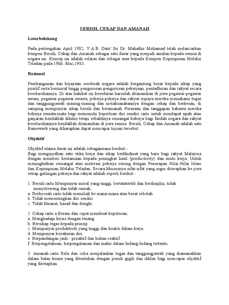 Bersih Cekap Amanah Pmo Gov My Bersih Cekap Dan Amanah Sebagai Satu Dasar Yang Menjadi Amalan Pdf Document
