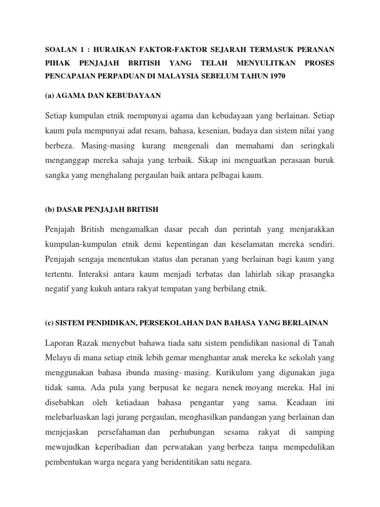 Huraikan Faktor Faktor Sejarah Termasuk Peranan Pihak Penjajah British Yang Telah Menyulitkan Proses Pencapaian Perpaduan Di Malaysia Sebelum Tahun 1970