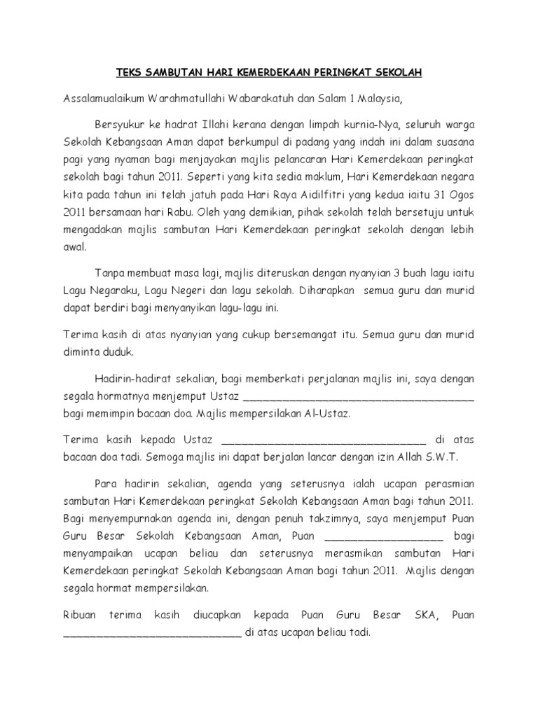 Teks Sambutan Hari Kemerdekaan Peringkat Sekolah