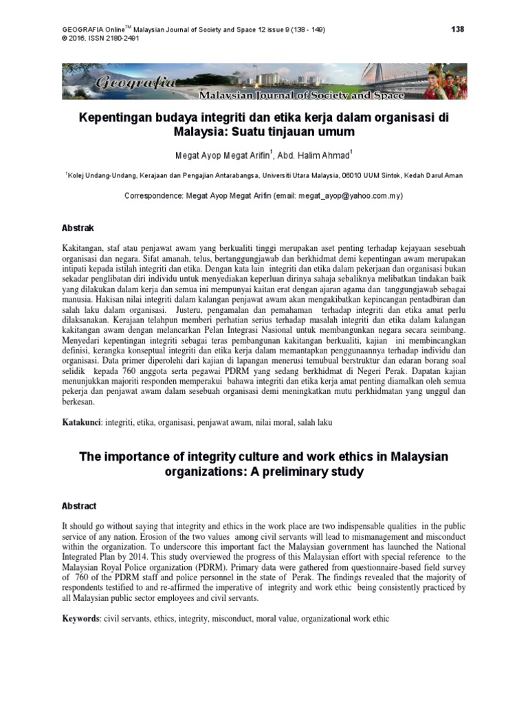 Pdf Integriti Daripada Perspektif Pengaduan Awam Satu Penelitian Di Jpj Malaysia